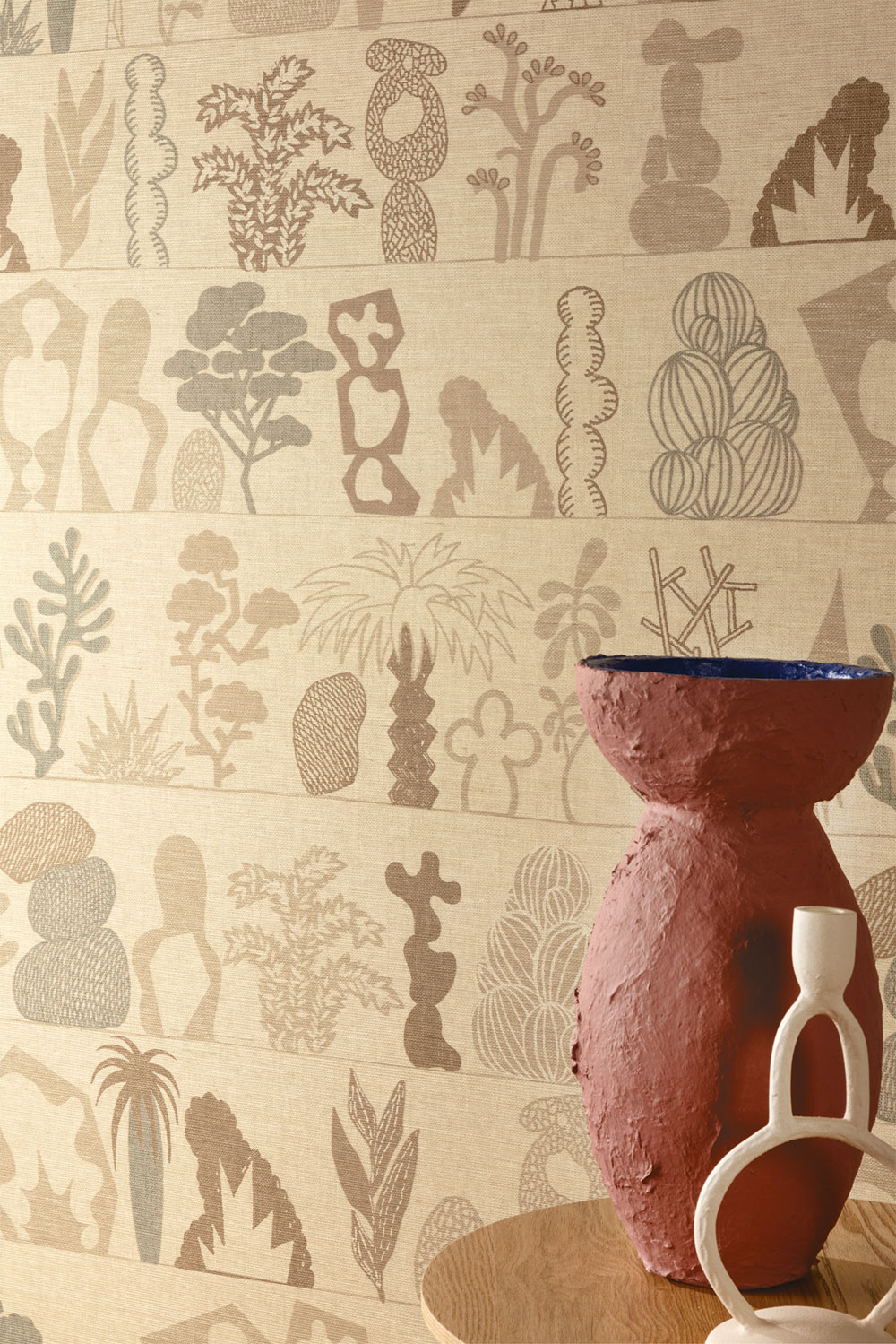 Vliesová tapeta na zeď, hrubší látková textura, motivy rostlin a nerostů na poličkách, odstíny béžové, hnědé a šedé.