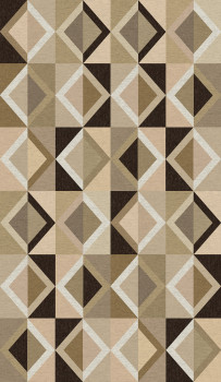 Geometrická vliesová tapeta na zeď, hrubá látková textura, odstíny béžové, hnědé, černé.