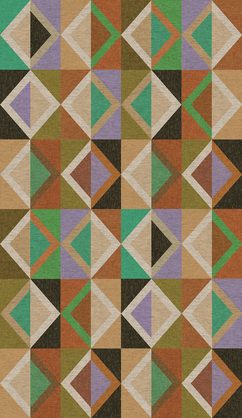 Geometrická vliesová tapeta na zeď, hrubá látková textura, odstíny zelené, hnědé, fialové a béžové.
