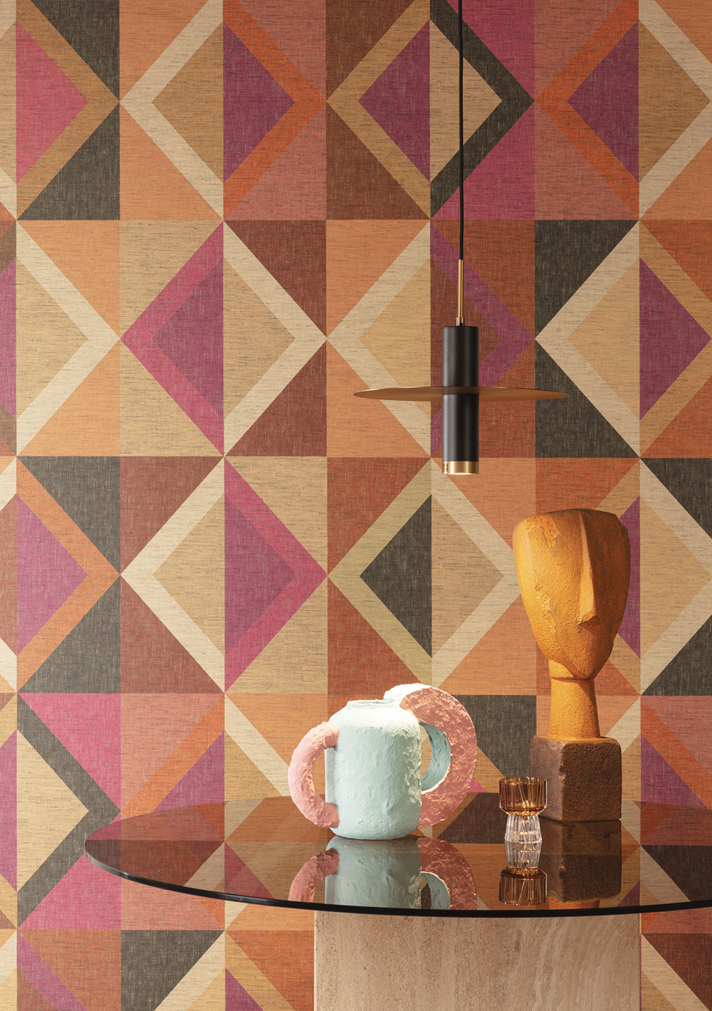 Geometrická vliesová tapeta na zeď, hrubá látková textura, odstíny hnědé, fialové, oranžové a béžové.