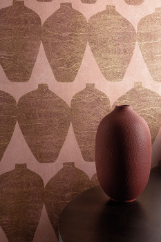 Vliesová tapeta na zeď, jemně plastický vzor váz v odstínech vínové a zlaté, pololesklý růžový podklad.