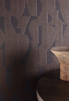 Vliesová tapeta na zeď, jemně plastický pololesklý geometrický vzor v odstínech hnědé na černém podkladu.