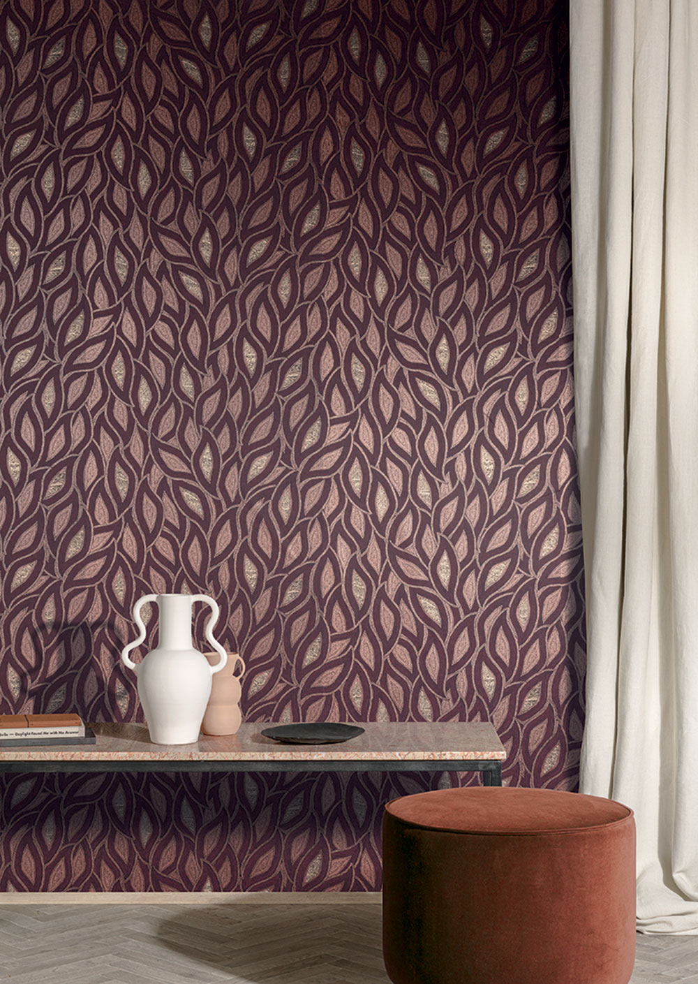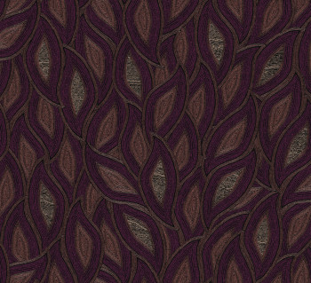 Vliesová tapeta na zeď, jemně plastický čárkovaný vzor listů v odstínech vínové, zlaté a bronzové.