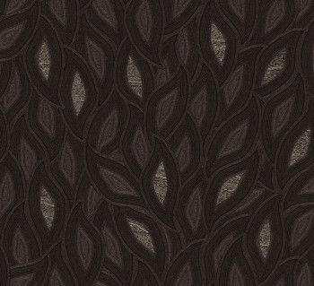 Vliesová tapeta na zeď, jemně plastický čárkovaný vzor listů v odstínech černé, kovově metalické a zlaté.