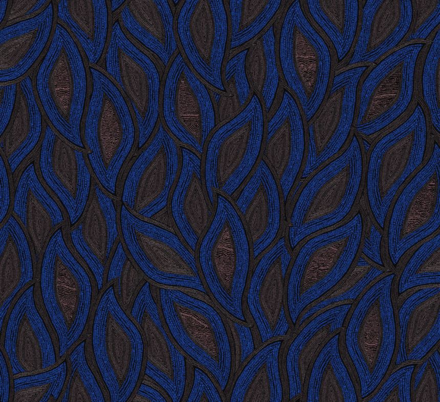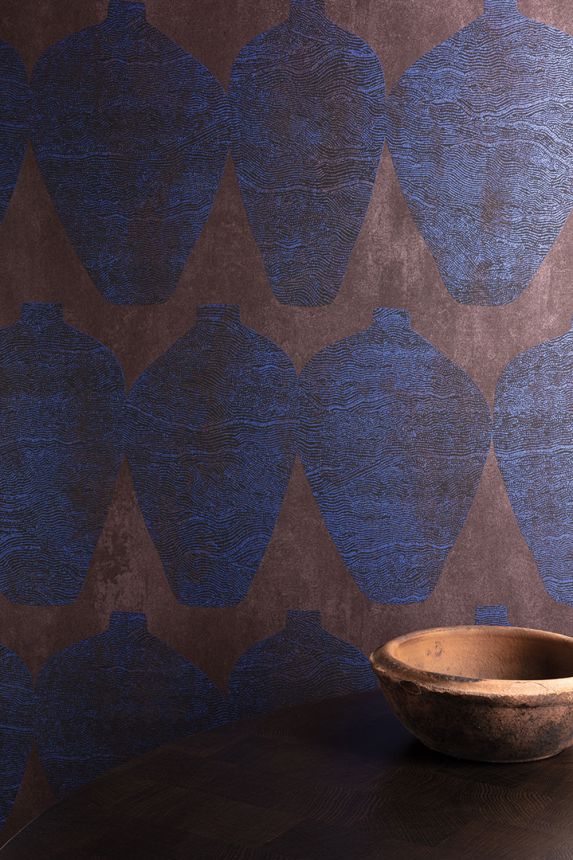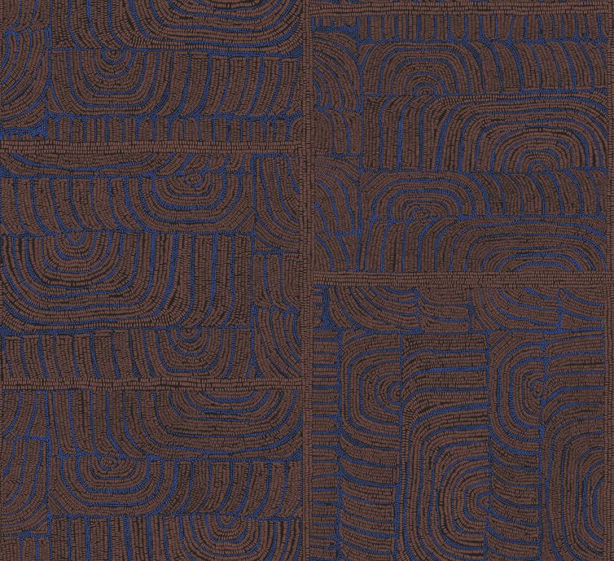 Vliesová tapeta na zeď, jemně plastický etno vzor v odstínech hnědé a metalické modré.