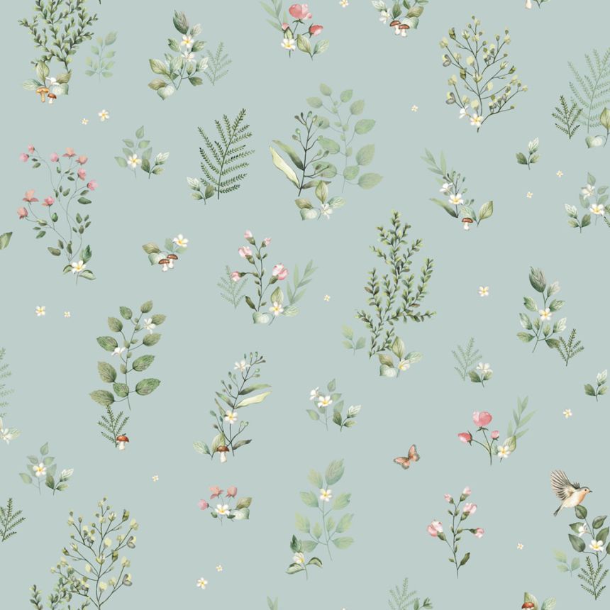 Tyrkysová vliesová tapeta na zeď, motivy rostlin, motýlů a ptáčků.