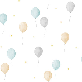 Bílá vliesová tapeta na zeď, hvězdičky a balonky v odstínech šedé, modré, zelené a žluté.