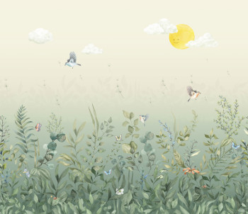 Dětská vliesová fototapeta na zeď, motivy rostlin, ptáčků a motýlů.