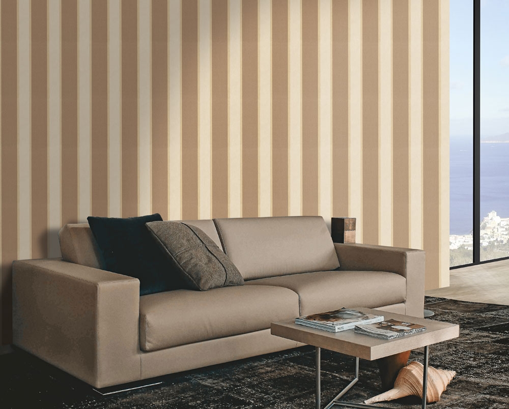 Netradiční vliesová tapeta s pruhy v odstínech krémové, béžové a hnědé. V hnědých pruzích ražený drobný vzorek. Snadno kombinovatelná se souvisejícími tapetami.