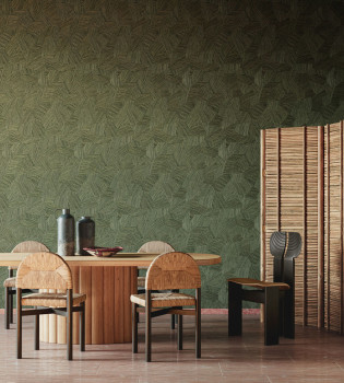 Luxusní vliesová tapeta s vinylovým povrchem, vzor věrná imitace štípaného skládaného ratanu, odstíny zelené.