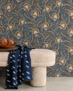 Modrá vliesová tapeta na zeď, netradiční květinový vzor inspirovaný africkou batikou, bronzové květy a části listů, další barvy - černá, hnědá.