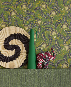 Zelená vliesová tapeta na zeď, netradiční květinový vzor inspirovaný africkou batikou, zlaté květy a části listů.