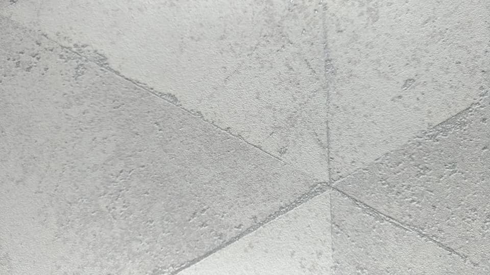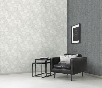 Vliesová tapeta s geometrickým vzorem v odstínech matné šedé, prosvítající prolisy metalické stříbrné.