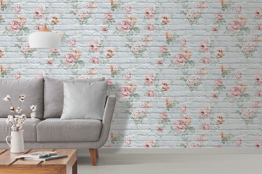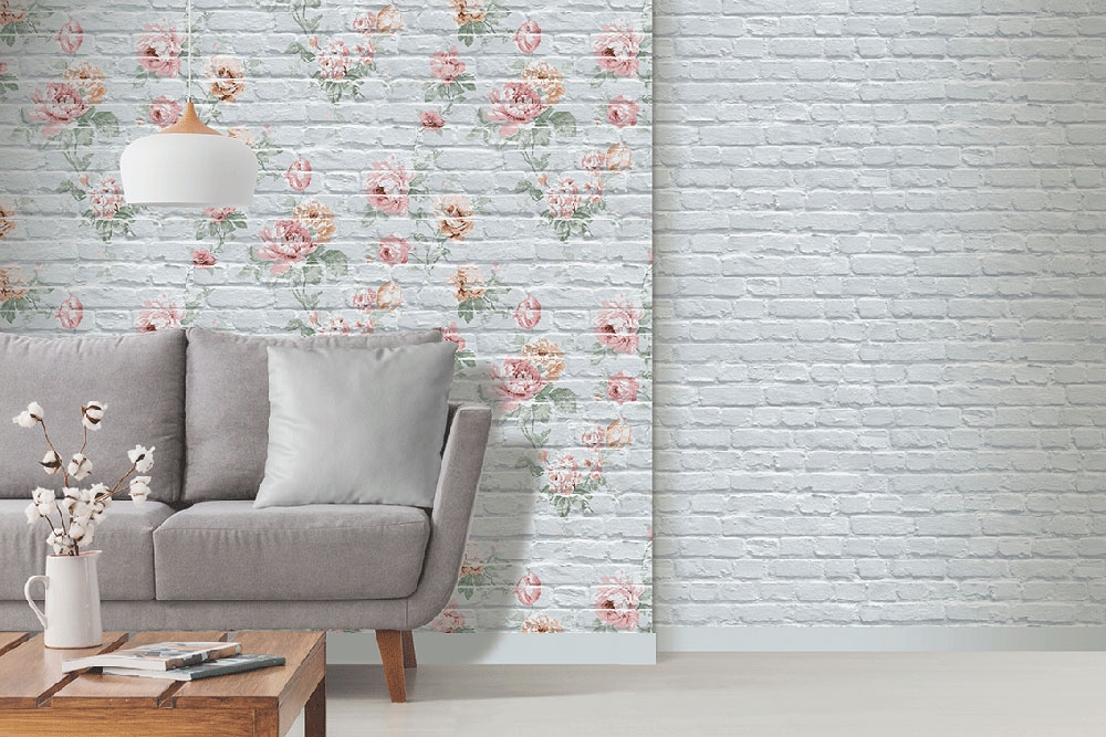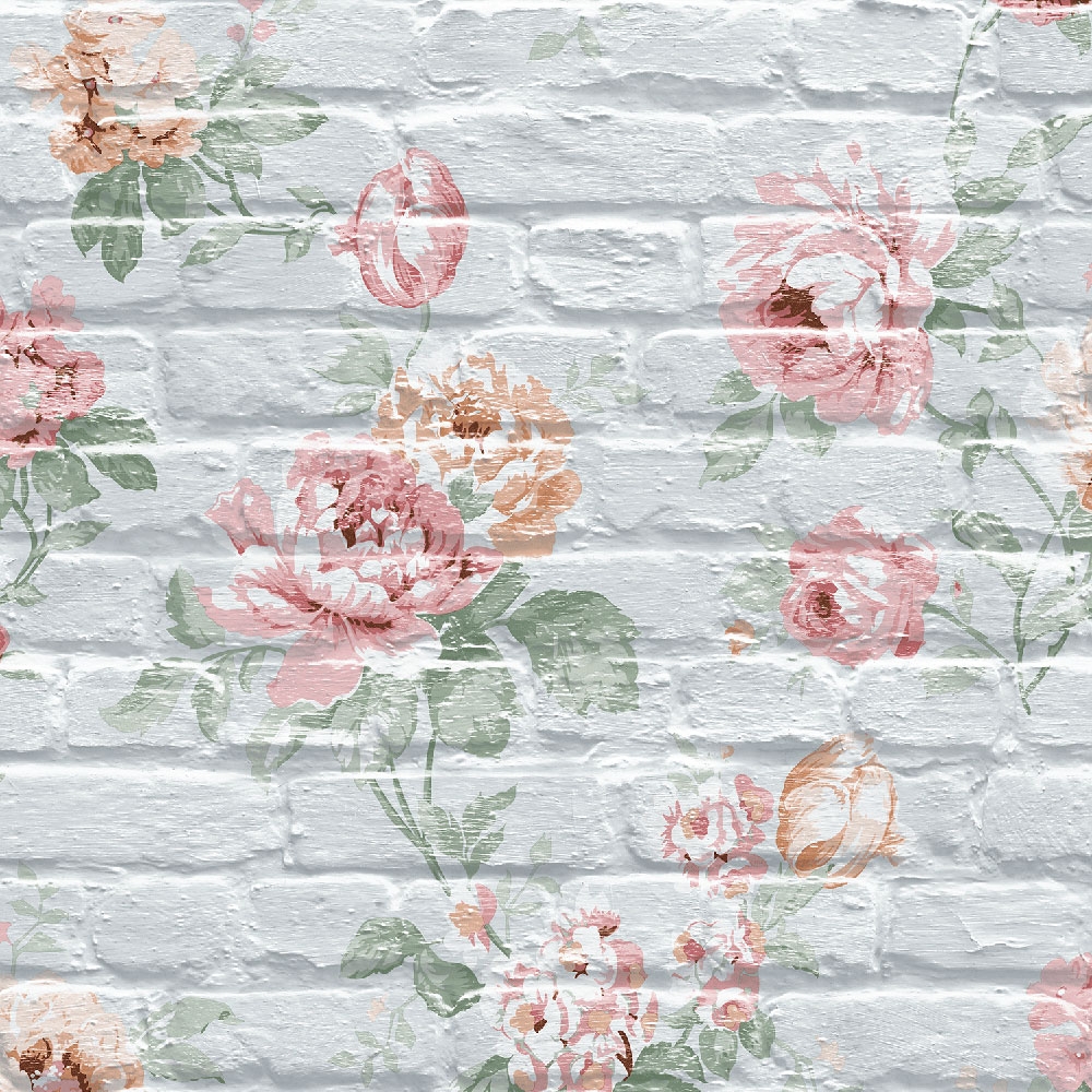 Skvělé netradiční spojení něžného romantického květinového vzoru a cihlové stěny. Cihly v šedo-modrých odstínech, vzor zelená, červená, cihlová. Kombinujte se souvisejícími vzory.