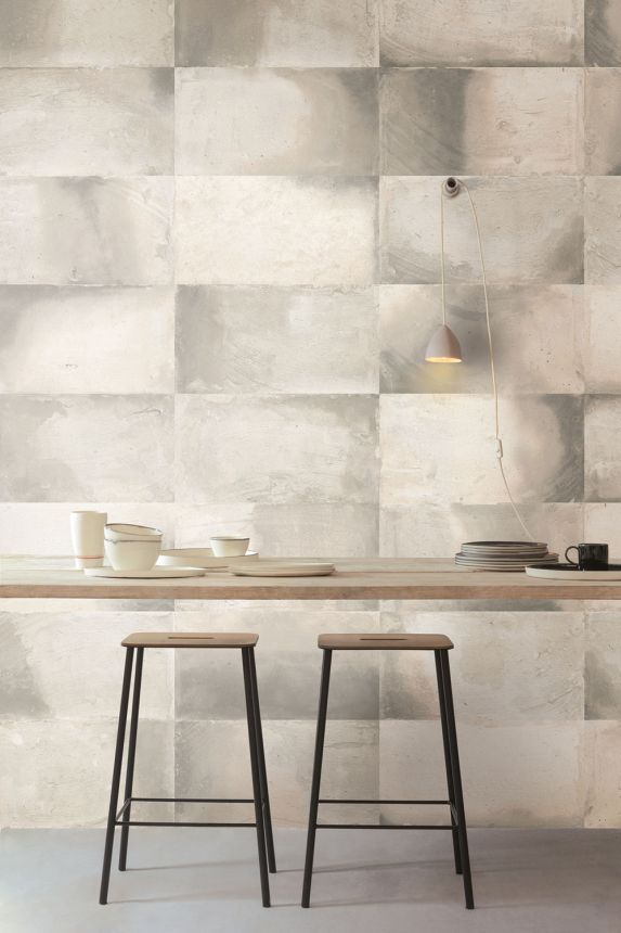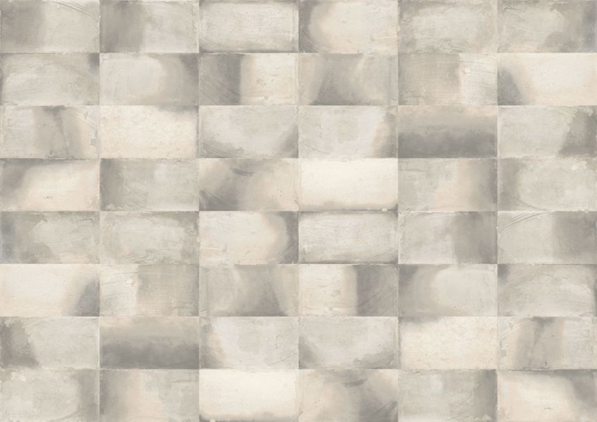 Vliesová obrazová tapeta na zeď, imitace obkladu v ostínech šedé a šedo-béžové.