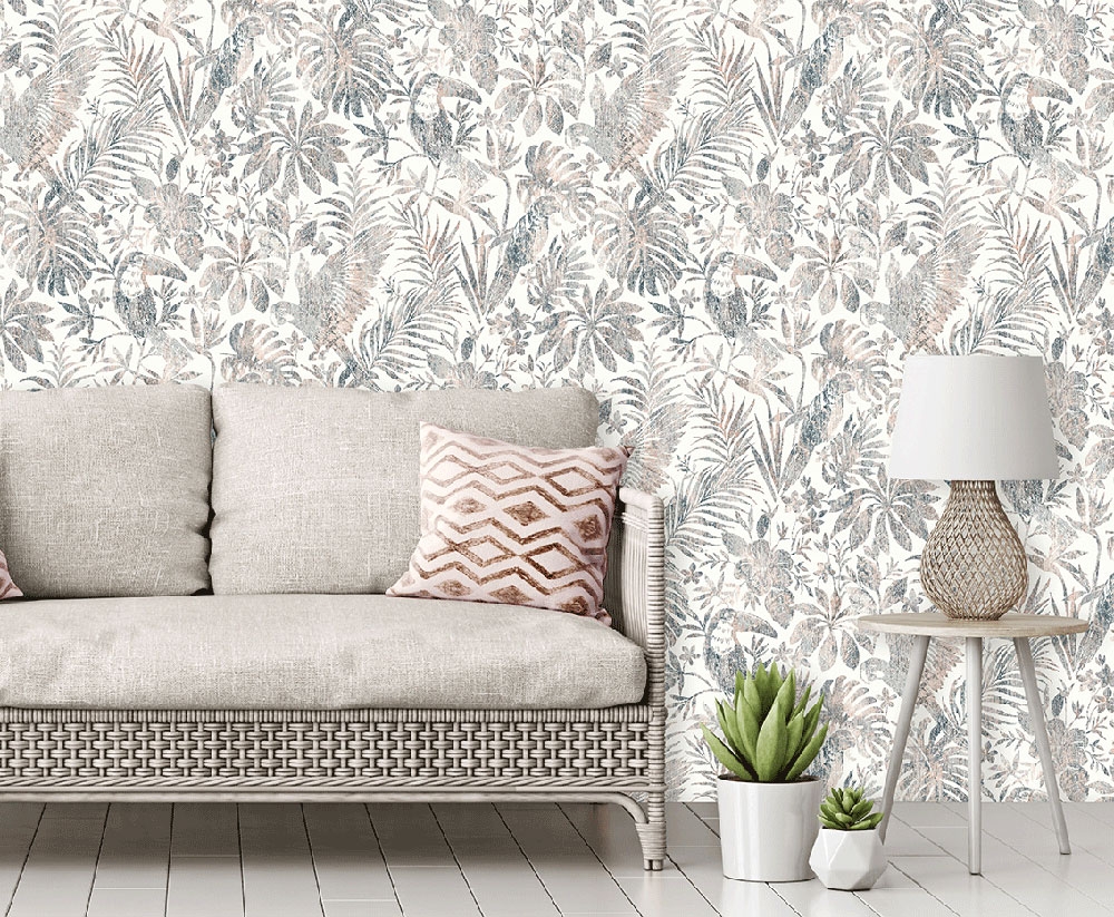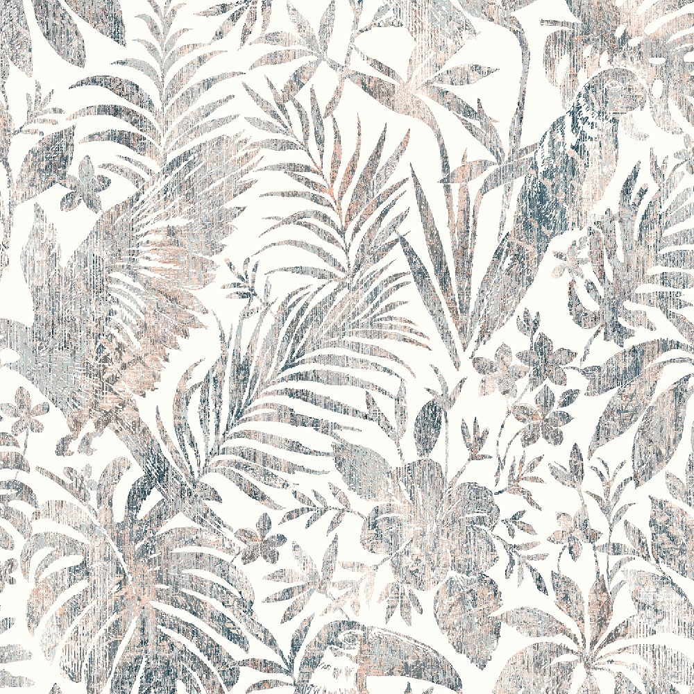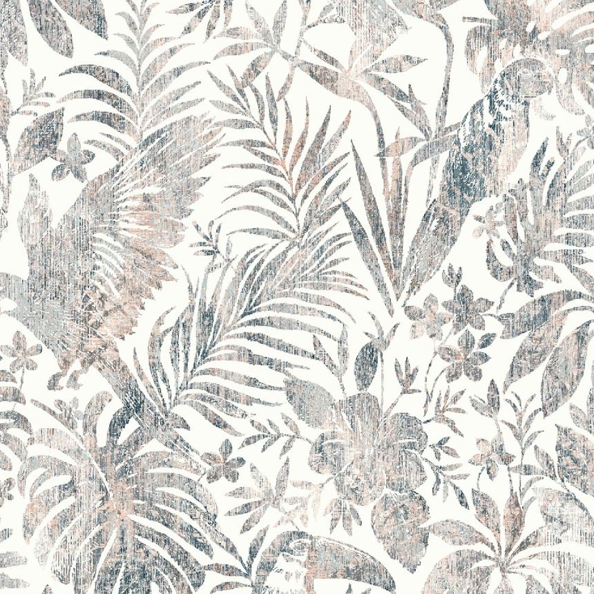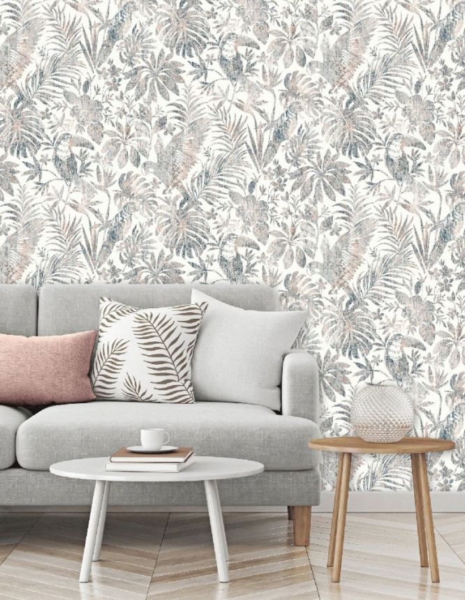 Exotika ve vintage stylu. Hladká textura, podklad krémový, částečně setřený vzor, papoušci a tukani, v odstínech šedé a hnědé.
