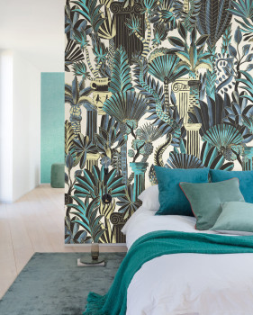 Vliesová obrazová tapeta na zeď, Tresor - motivy rostlin, palem, historických sloupů a váz.