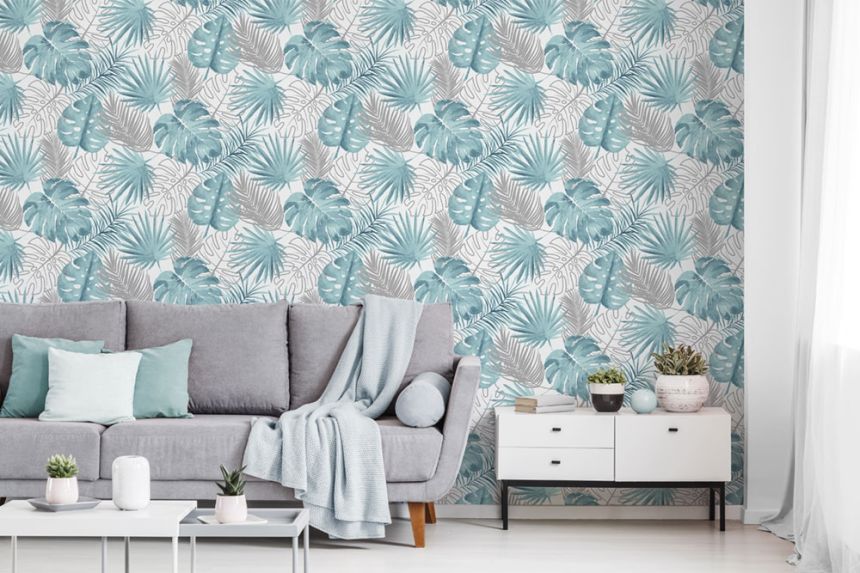 Rostlinné a přírodní motivy vnesou do interiéru klid a harmonii. Hladká, bílá, vliesová tapeta s dekorem palem a monstery v odstínech tyrkysové a jemně plastické šedo-stříbrné se stříbrnými třpytkami.