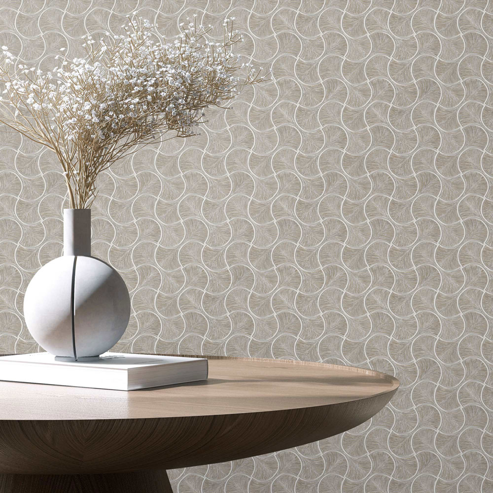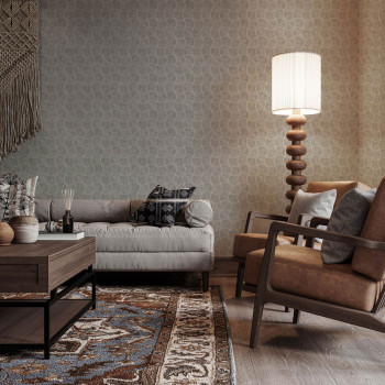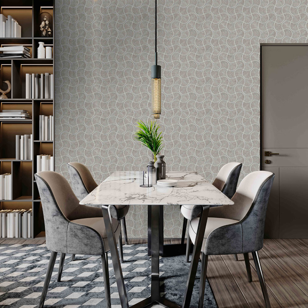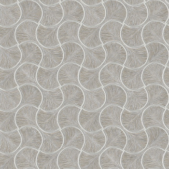 Geometrická vliesová tapeta s vinylovým povrchem, výrazné textury, odstíny pololesklé šedé a šedo-béžové.
