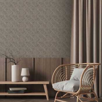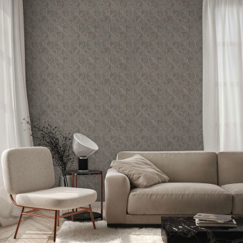 Geometrická vliesová tapeta s vinylovým povrchem, výrazné textury, odstíny pololesklé hnědé s šedými akcenty.