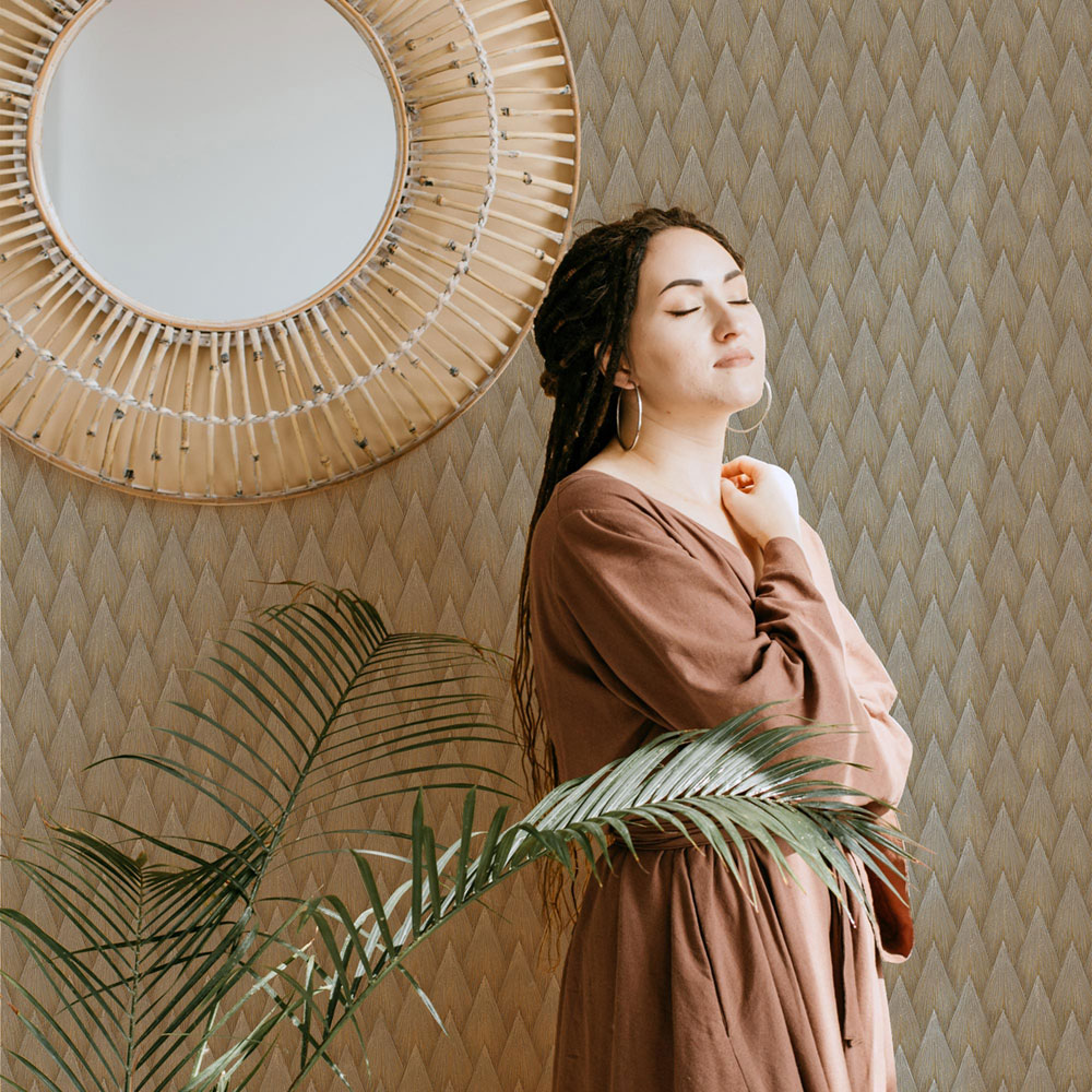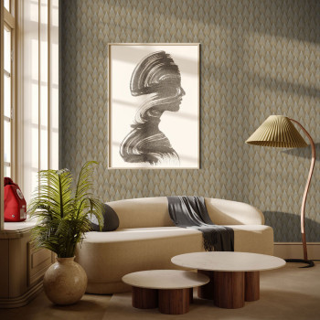 Geometrická vliesová tapeta s vinylovým povrchem, výrazné textury, odstíny hnědé a zlaté.
