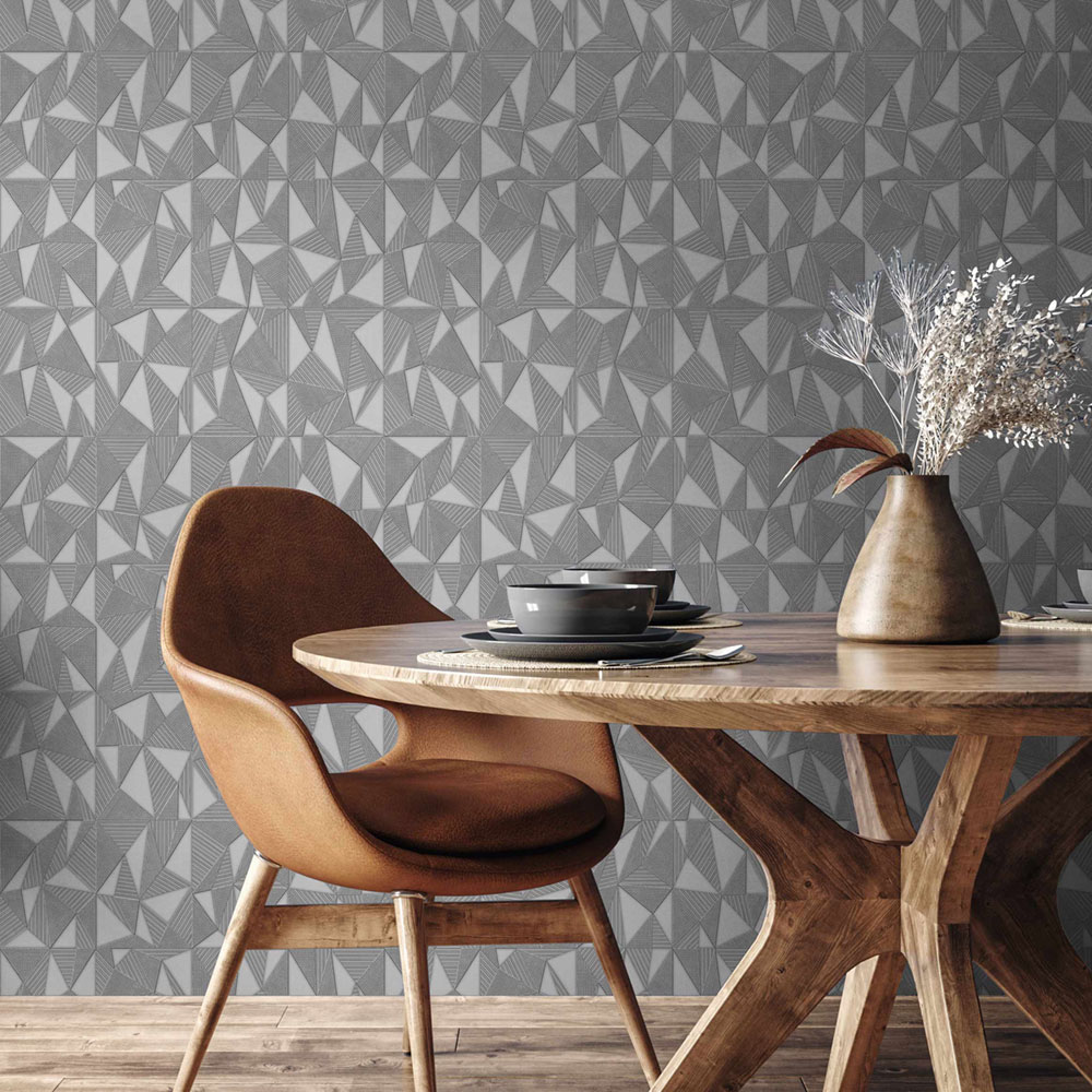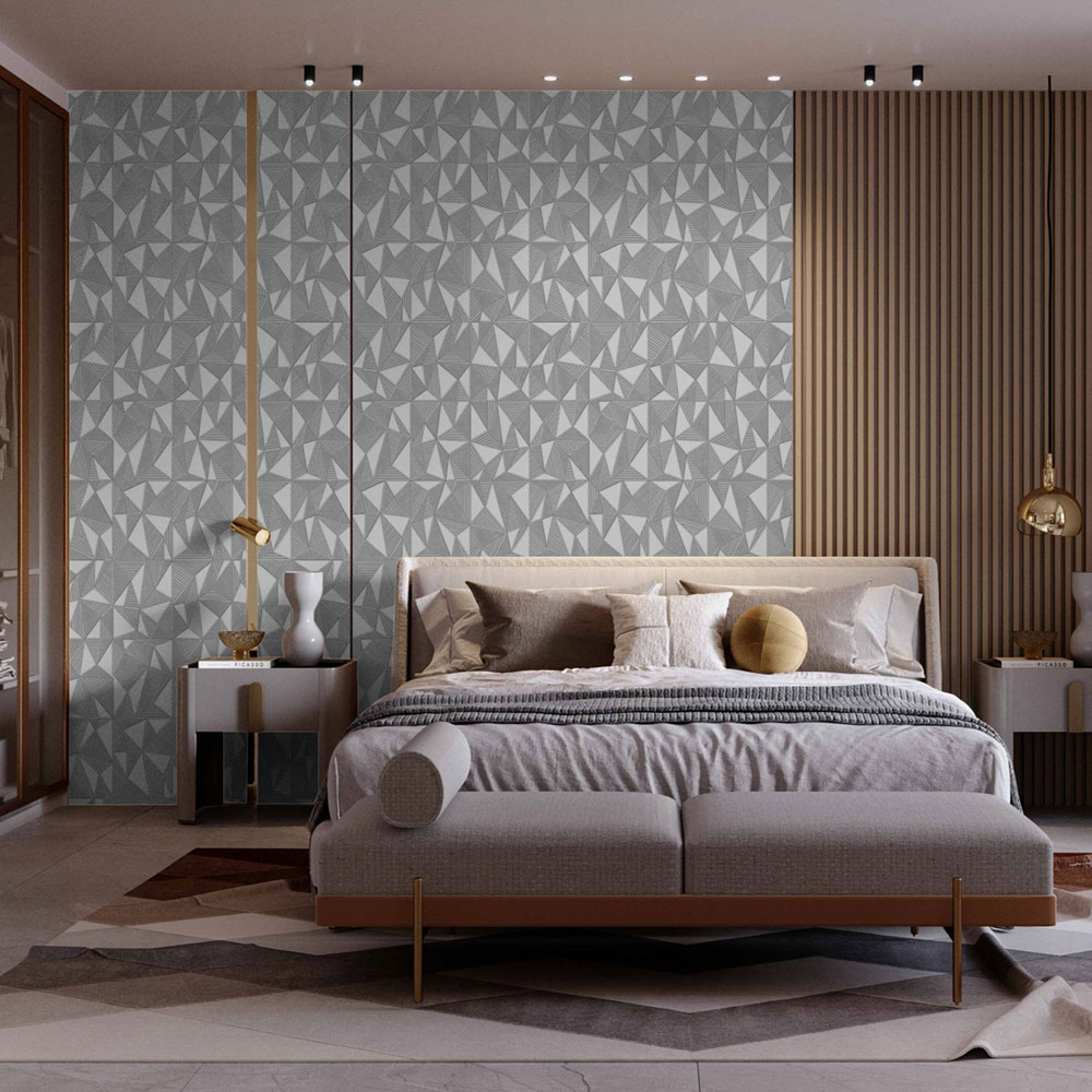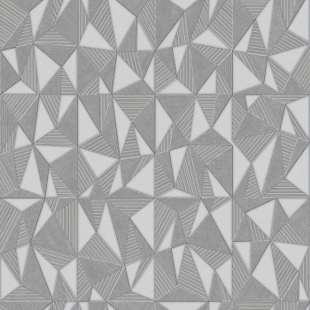 Geometrická vliesová tapeta s vinylovým povrchem, výrazné textury, odstíny pololesklé šedé.