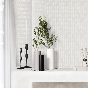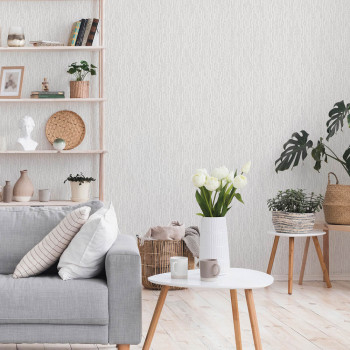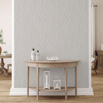 Geometrická vliesová tapeta s vinylovým povrchem, jemná látková textura, odstíny krémové s metalickými odlesky.