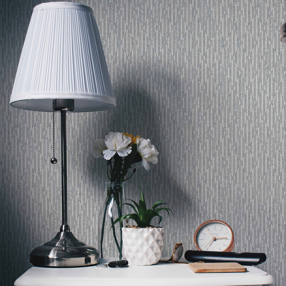 Geometrická vliesová tapeta s vinylovým povrchem, jemná látková textura, odstíny šedé s metalickými stříbrnými odlesky.