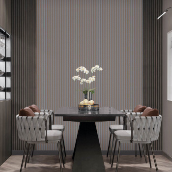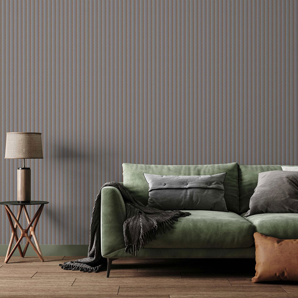 Vliesová tapeta s vinylovým povrchem, imitace proplétané lýkové rohože, odstíny pololesklé tmavě šedé s bronzovými akcenty vytváří pruhy.