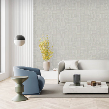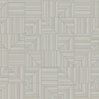 Vliesová tapeta s vinylovým povrchem, geometrický vzor, imitace textile, odstíny šedé a šedo- béžové.