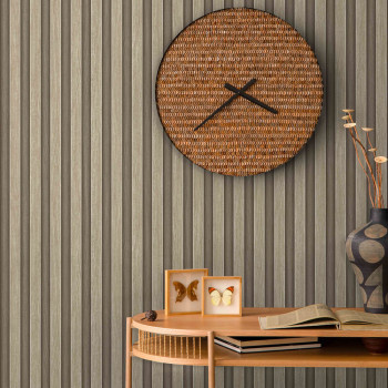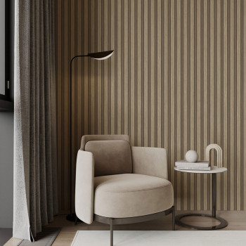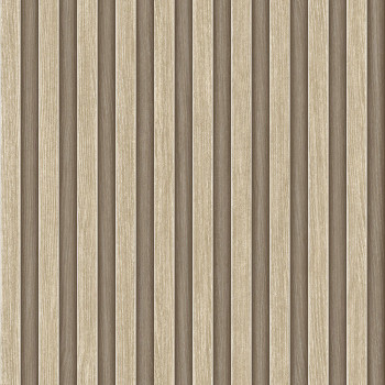 Vliesová tapeta s vinylovým povrchem, imitace dřeva, dřevěných palubek, obložení, lamel, jemná struktura dřeva, odstíny hnědé a béžové.