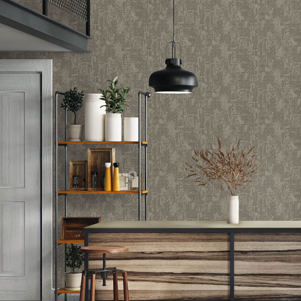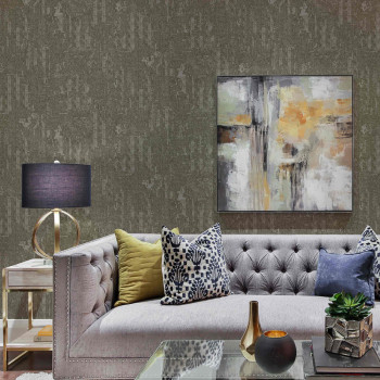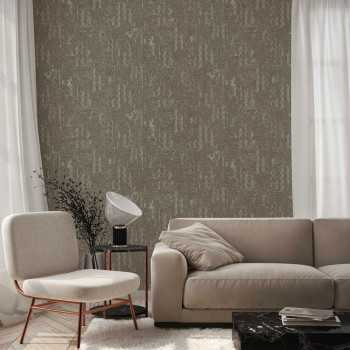 Vliesová tapeta s vinylovým povrchem, design inspirovaný látkovou texturou, šedo-hnědá s jemným stříbrným pololeskem.