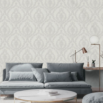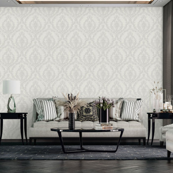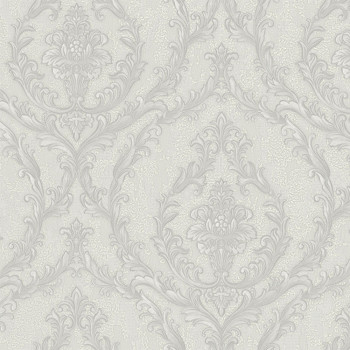 Luxusní šedá vliesová tapeta s vinylovým povrchem, zámecký vzor s drobnými stříbrnými třpytkami.