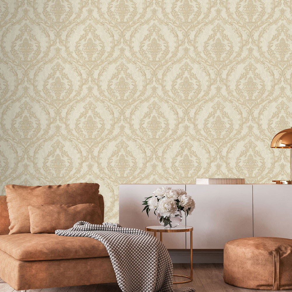 Luxusní béžová vliesová tapeta na zeď, zámecký vzor s drobnými třpytkami.