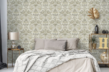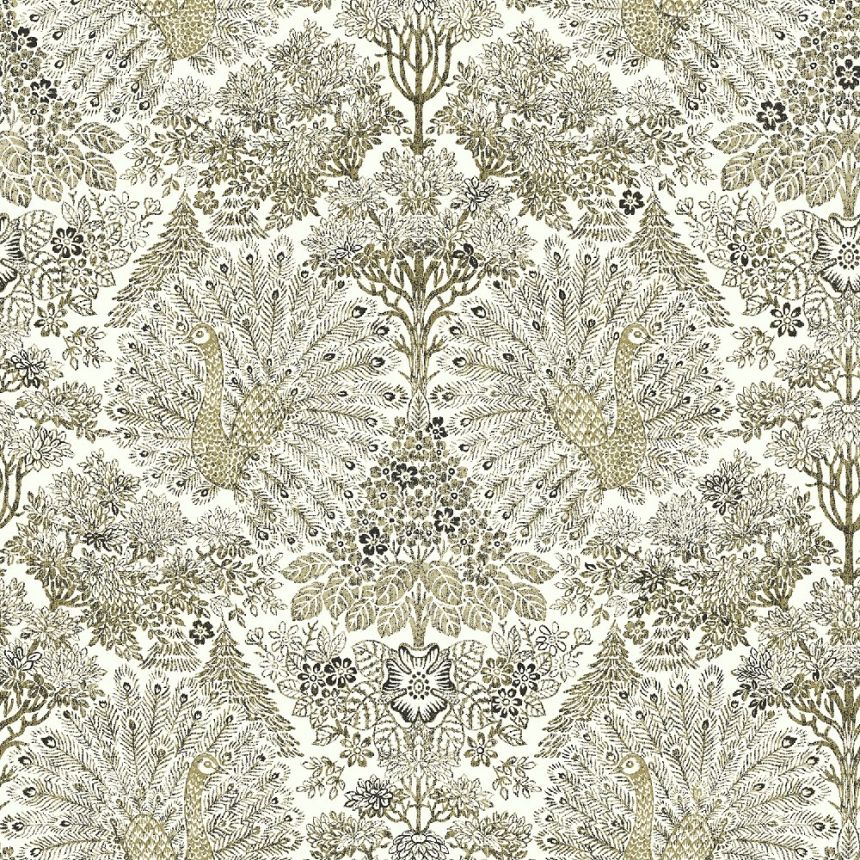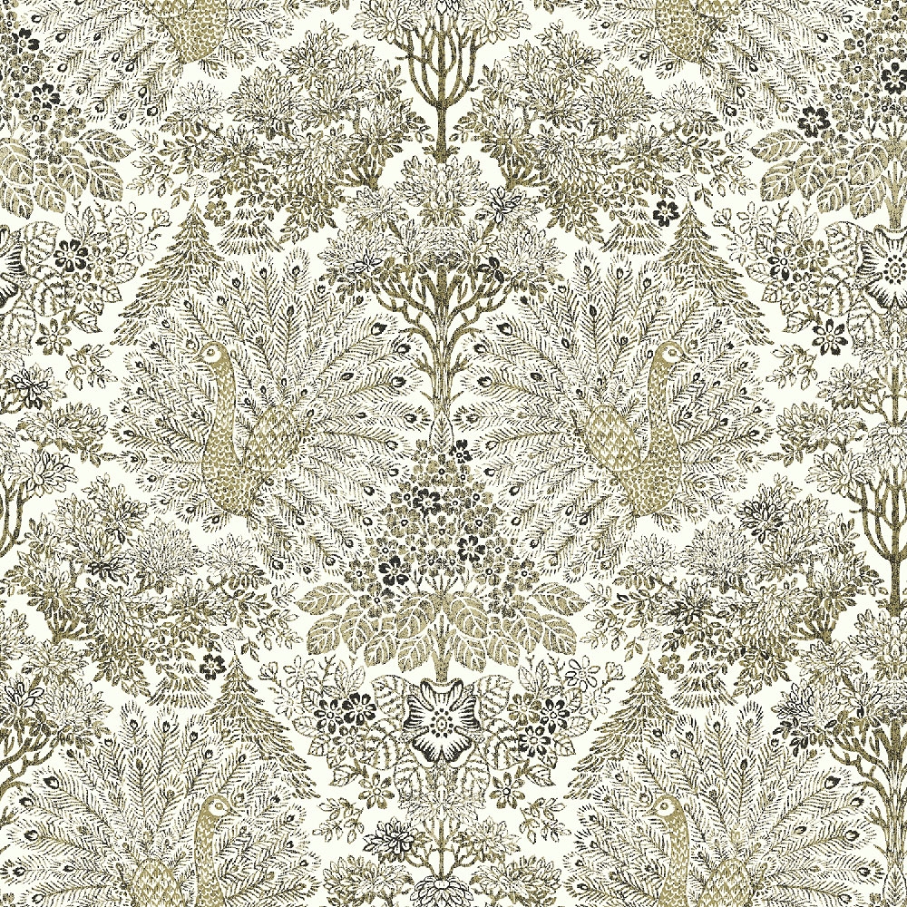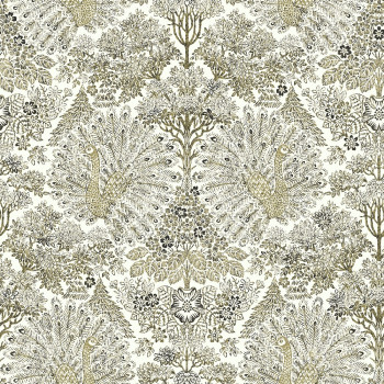 Překrásný, romantický motiv pávů, stromů a květin. Textura připomíná jemně strukturouvanou textilii v krémové barvě, vzor zlatavý, jemně lesklý, černé detaily.