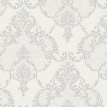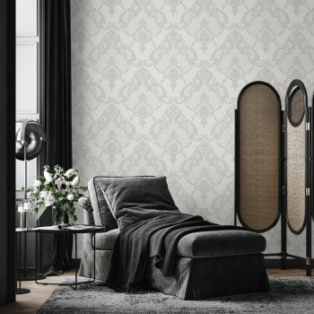 Luxusní šedo-krémová vliesová tapeta na zeď, zámecký vzor s pololeskem, drobné stříbrné třpytky.