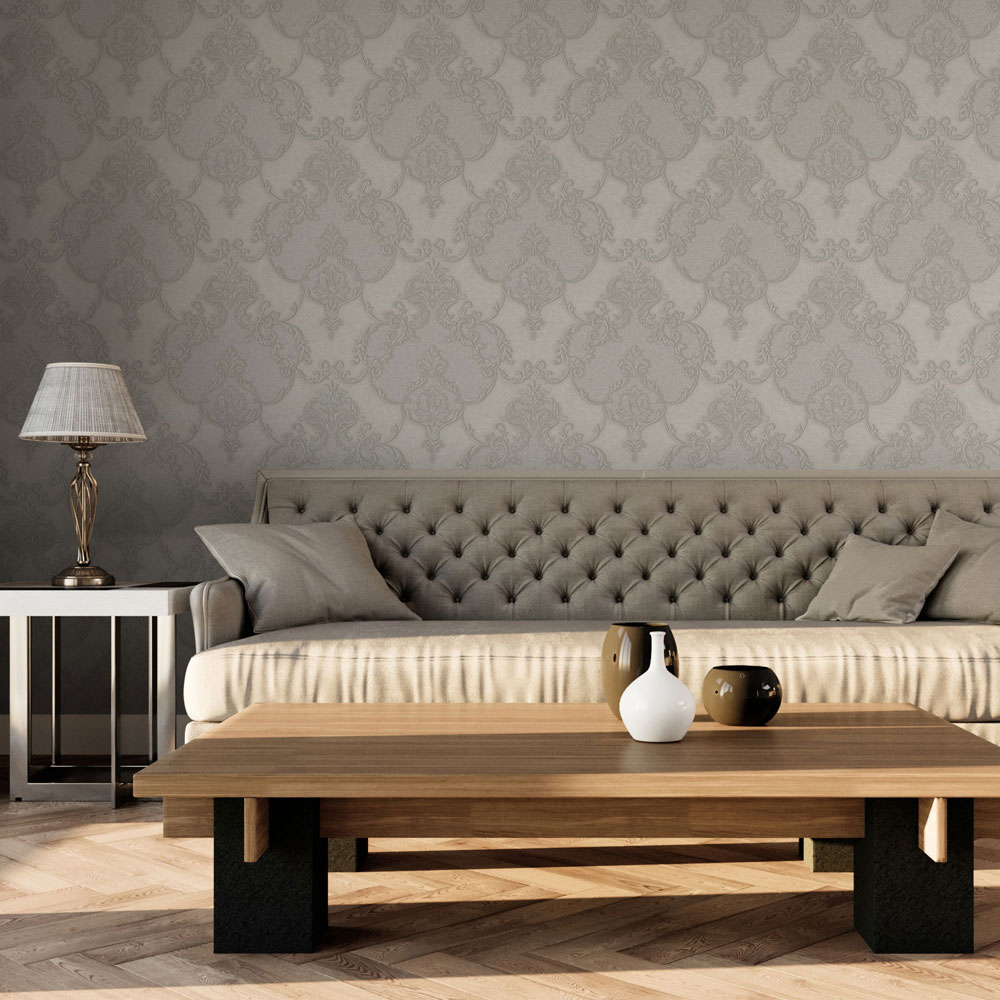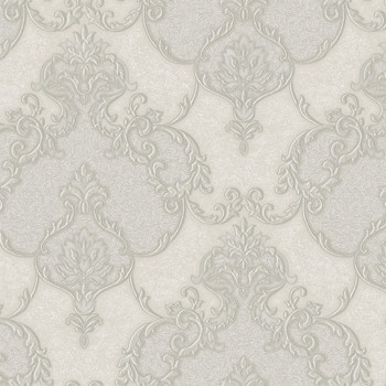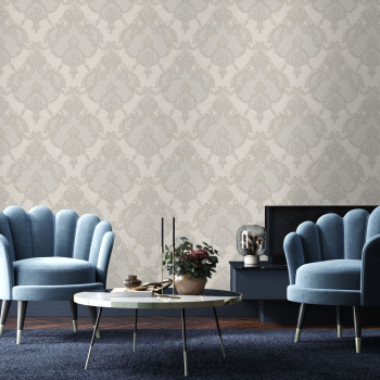 Luxusní vliesová tapeta na zeď, zámecký vzor s zlatým pololeskem, drobné třpytky, odstíny šedé a šedo-béžové.
