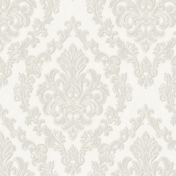 Luxusní krémovo-bílá vliesová tapeta na zeď, zámecký vzor s perlovým pololeskem, drobné stříbrné třpytky.