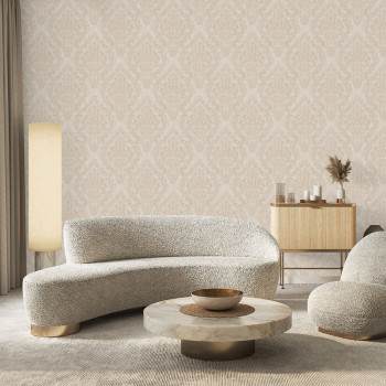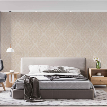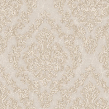 Luxusní béžová vliesová tapeta s vinylovým povrchem, pololesklý béžový zámecký vzor s drobnými třpytkami.