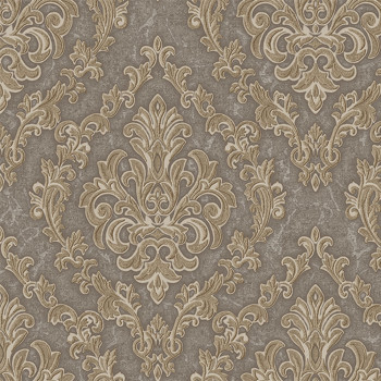 Luxusní hnědá vliesová tapeta s vinylovým povrchem, pololesklý hnědo-béžový zámecký vzor s drobnými zlatými třpytkami.