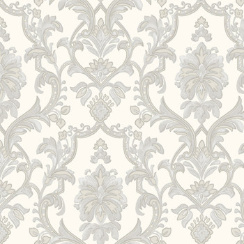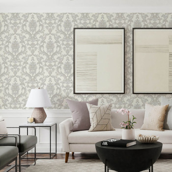 Luxusní krémová vliesová tapeta na zeď, šedo-béžový zámecký vzor se stříbrnými třpytkami.