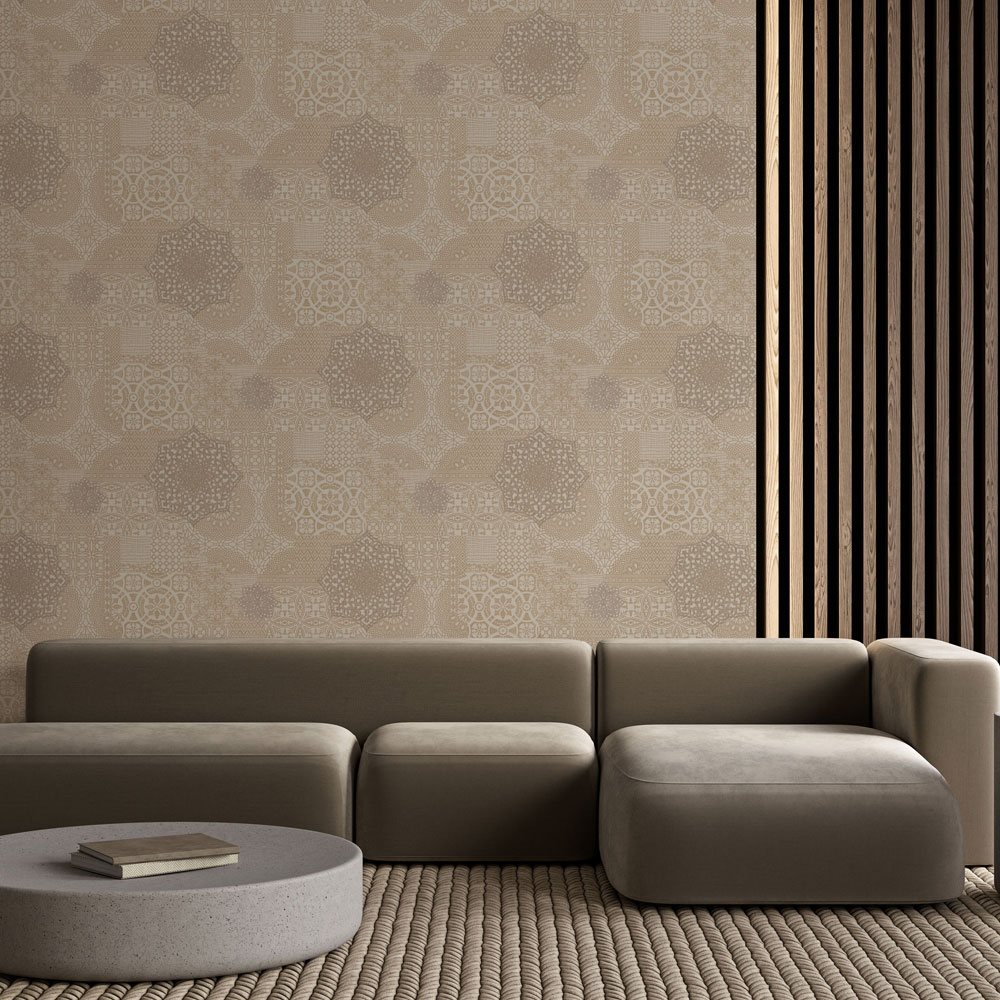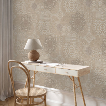 Luxusní hnědo-béžová vliesová tapeta na zeď, imitace vyšívání a krajky, místy drobné třpytky.