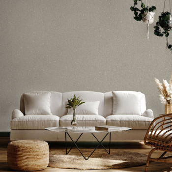 Luxusní pololesklá šedo-béžová vliesová tapeta na zeď, imitace látky, místy drobné zlaté třpytky.