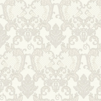 Luxusní krémovo-bílá vliesová tapeta na zeď, zámecký vzor s perlovým pololeskem, drobné stříbrné třpytky.