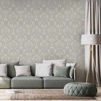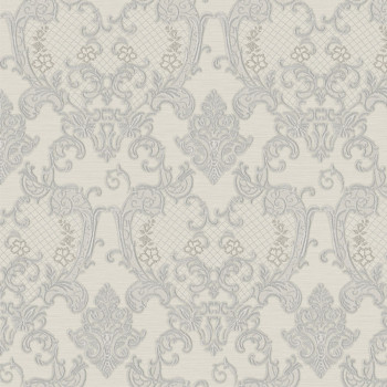 Luxusní šedá vliesová tapeta na zeď, zámecký vzor se stříbrným pololeskem, drobné stříbrné třpytky.