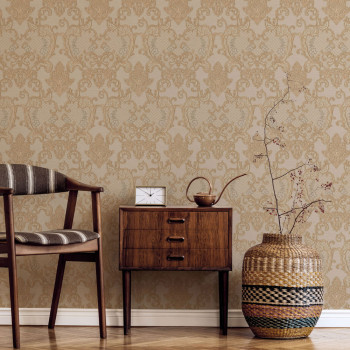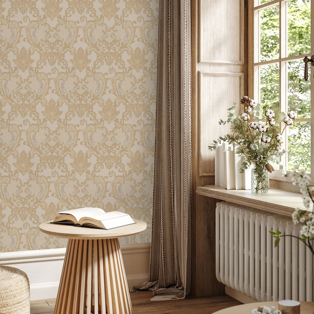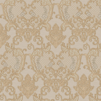 Luxusní světle béžová vliesová tapeta na zeď, zámecký vzor se zlato-béžovým pololeskem, drobné zlaté třpytky.
