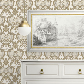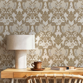 Luxusní krémová vliesová tapeta na zeď, hnědo-zlatý zámecký vzor, drobné zlaté třpytky.
