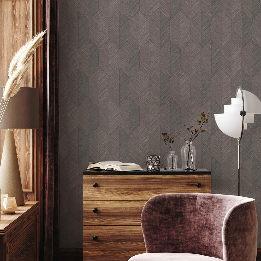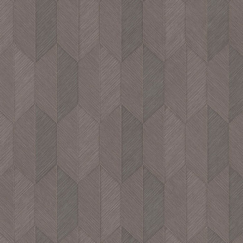 Pololesklá vliesová tapeta s vinylovým povrchem, strukturovaný geometrický vzor v odstínech hnědé a hnědo-šedé.