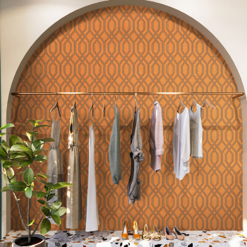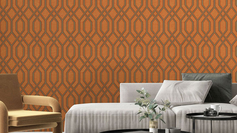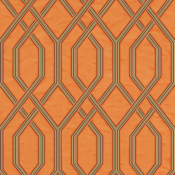 Luxusní pololesklá vliesová tapeta s vinylovým povrchem, oranžový podklad, plastické obrysy v metalické vínové, zelené a zlaté.