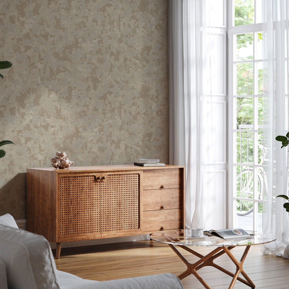 Luxusní vliesová tapeta s vinylovým povrchem, štukový vzor, hnědo-béžový pololesk.